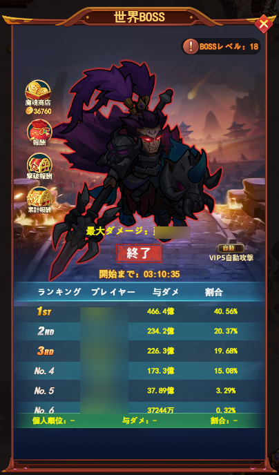 - BOSSに与えたダメージ上位のプレイヤーはランキング報酬がもらえます。イベント終了後、メールでお送りします。