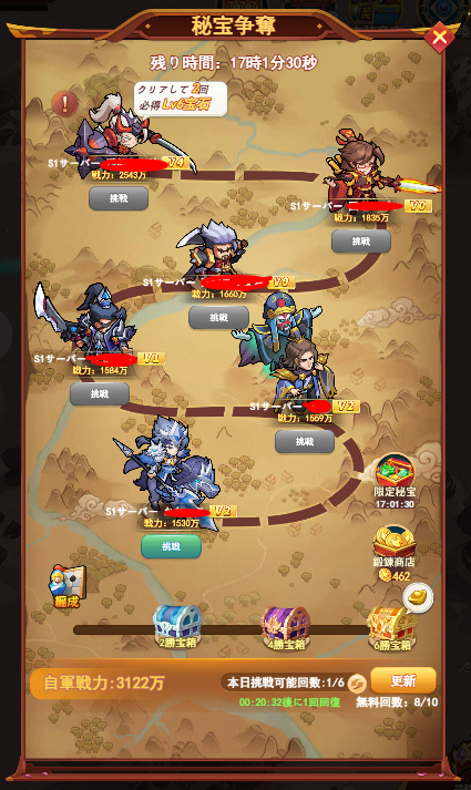 自然回復での挑戦権は1日24回ですから無料更新10回もあれば使い切ることもないはずです。ただし、水曜日は宝物争奪と無料更新は共有で10回となっています。
