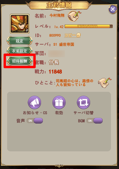 - 画面下の招待ボタンからフレンドを「ぷちっと三国志」に招待し二人とも報酬を受け取ることが可能な機能です!